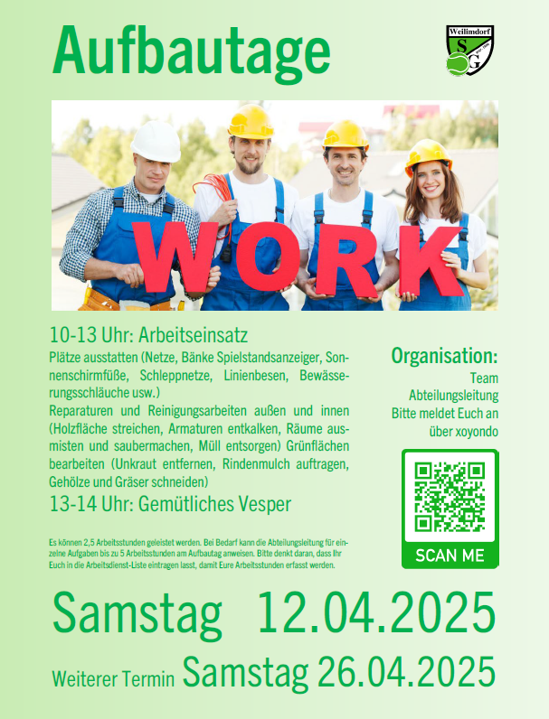 wir starten endlich wieder in die Draußensaison und rufen Euch zur Teilnahme am Aufbautag auf. Für alle Mitglieder der Tennisabteilung ab 15 Jahre gilt die Pflicht zur Ableistung von Arbeitsstunden. Weitere Informationen dazu findet Ihr im Beitrag "Arbeitstunden" hier auf der Webseite.