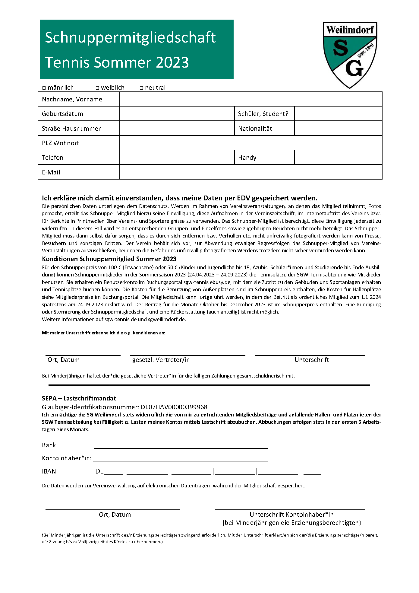 Schnuppermitglied kannst Du werden, wenn Du diese Anmeldung ausgefüllt an vorstand@sgw-tennis.de geschickt hast. Du erhältst eine Willkommens-Email mit wichtigen Infos und den Zugangsdaten zum Buchungssystem: