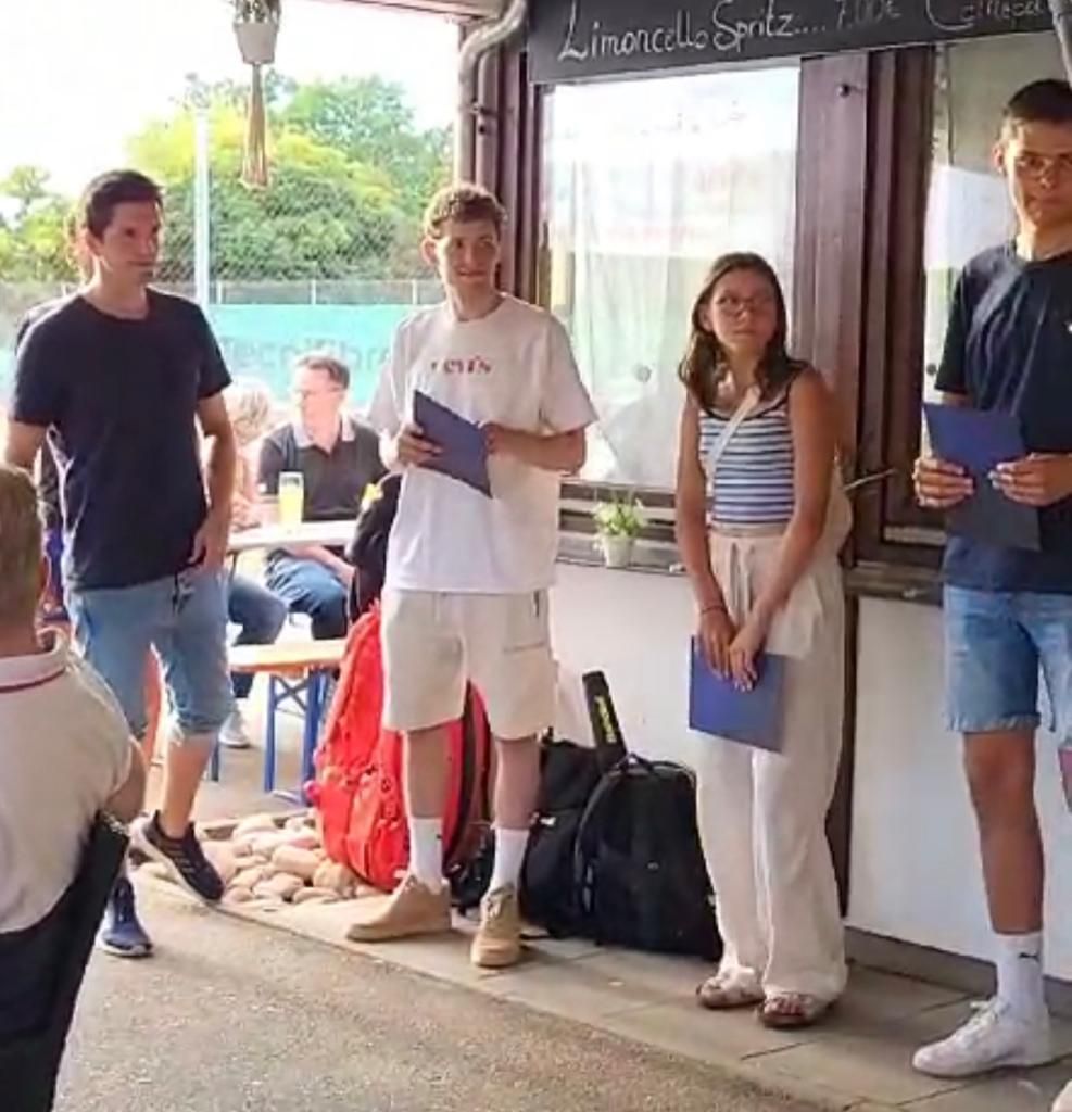 Den Start machten ab 10 Uhr die 15 Teilnehmenden der Vereinsmeisterschaft. Die beiden Veranstalter Nikolai und Roman ließen im K.O.-Modus mit einer Haupt- und Nebenrunde nach jeweils 4 Spielen auf einen Satz die Gewinner ausspielen. Aus unserem Tennis-Nachwuchs haben es diese 3 auf das Treppchen geschafft und Gutschein für unser Ristorante Golfo di Napoli gewonnen: